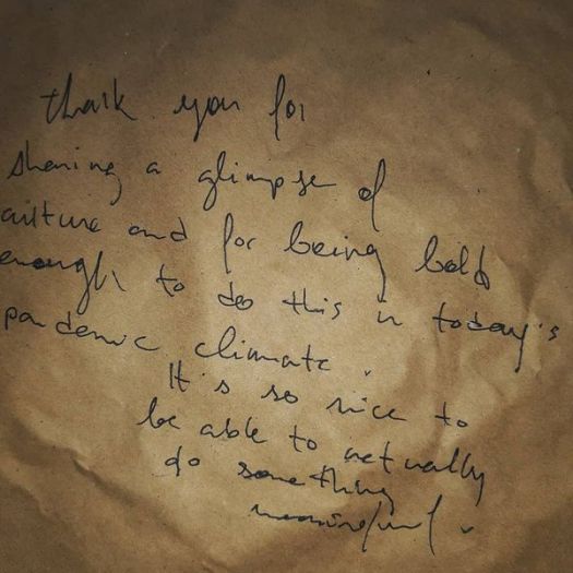 theme: thank you for attending our art show a host thanks people for coming and invites feedback written on large pieces of paper